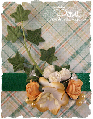 Embellishments: Flowers, ivy leaves, ribbon, pins and pearls all from my stash.